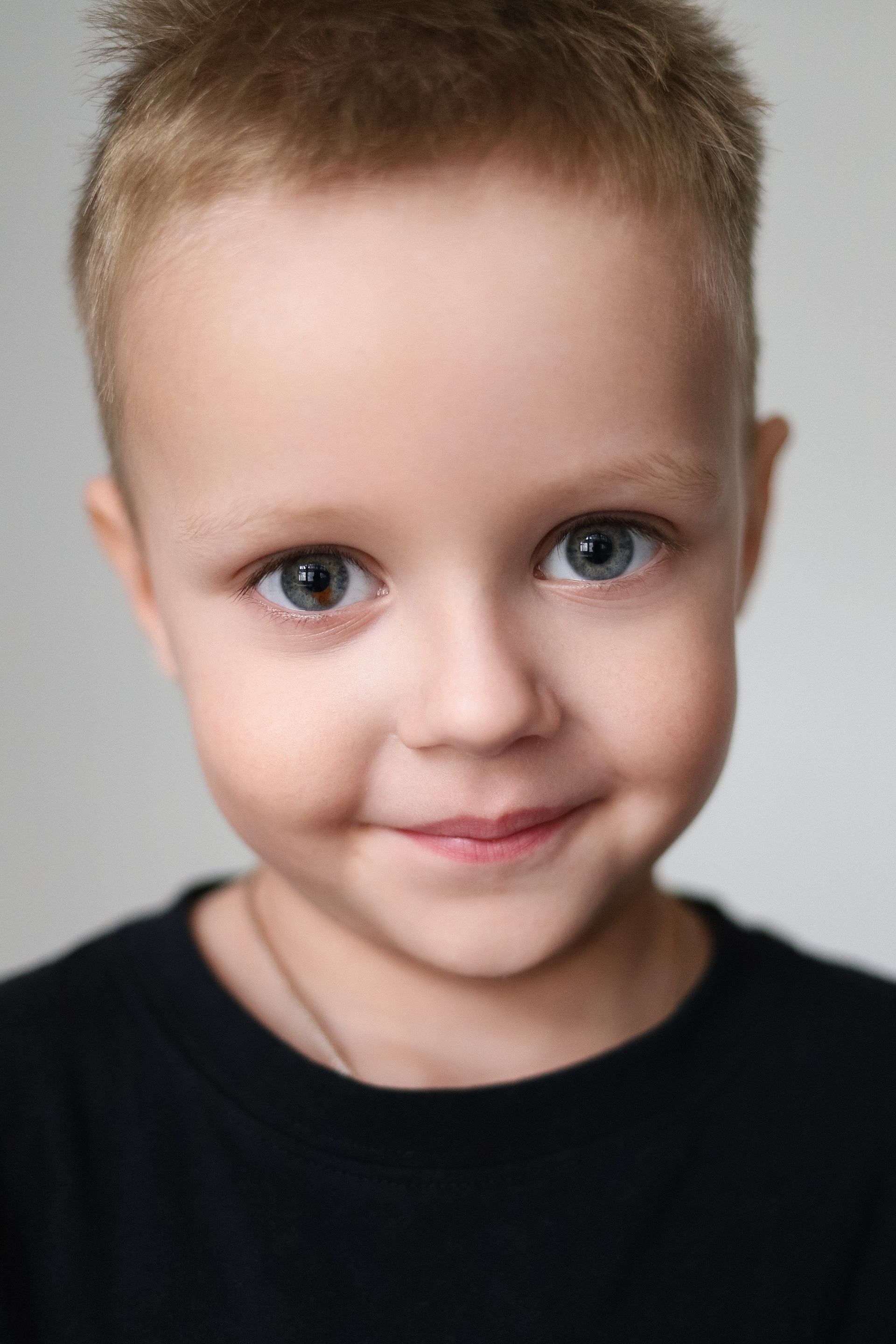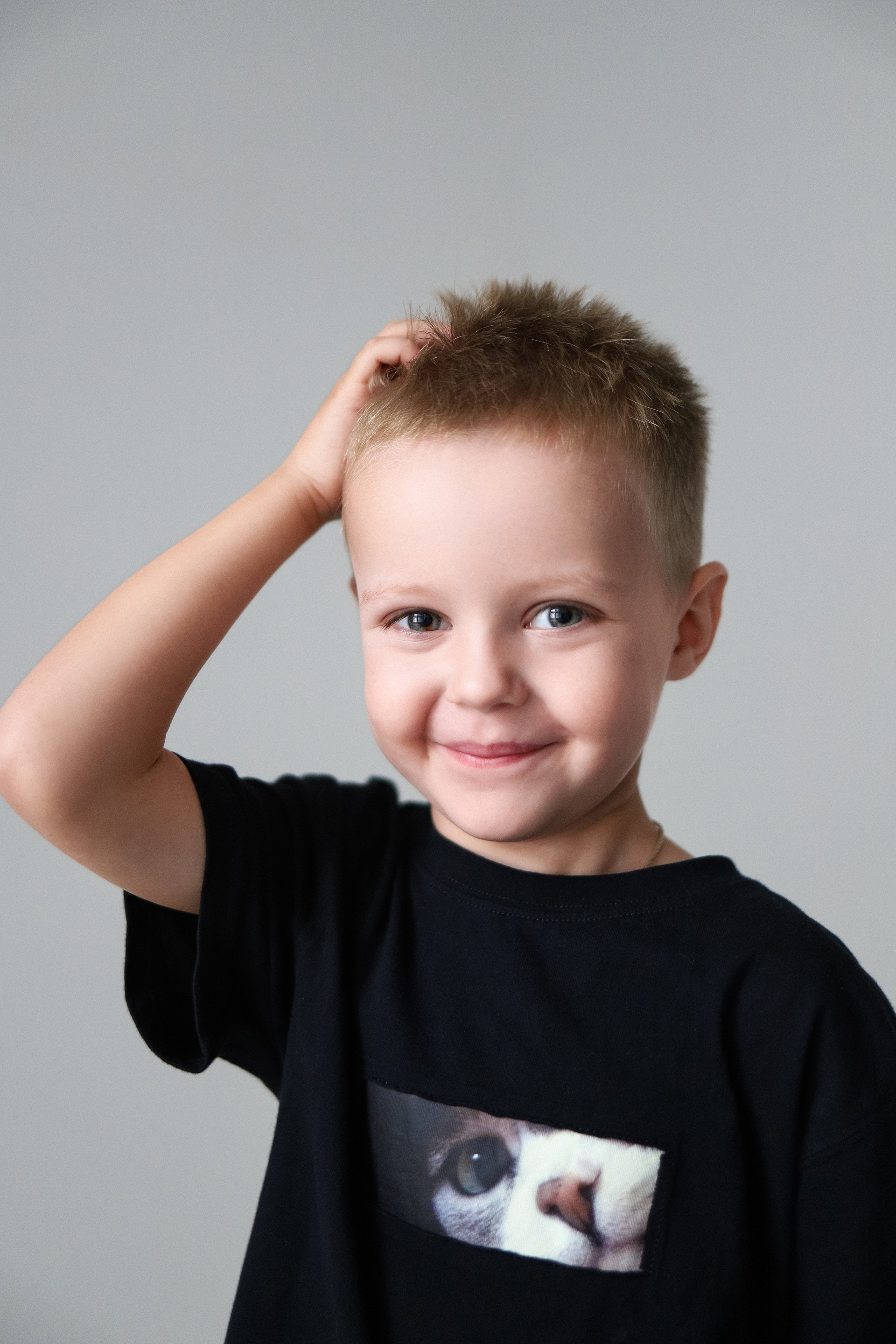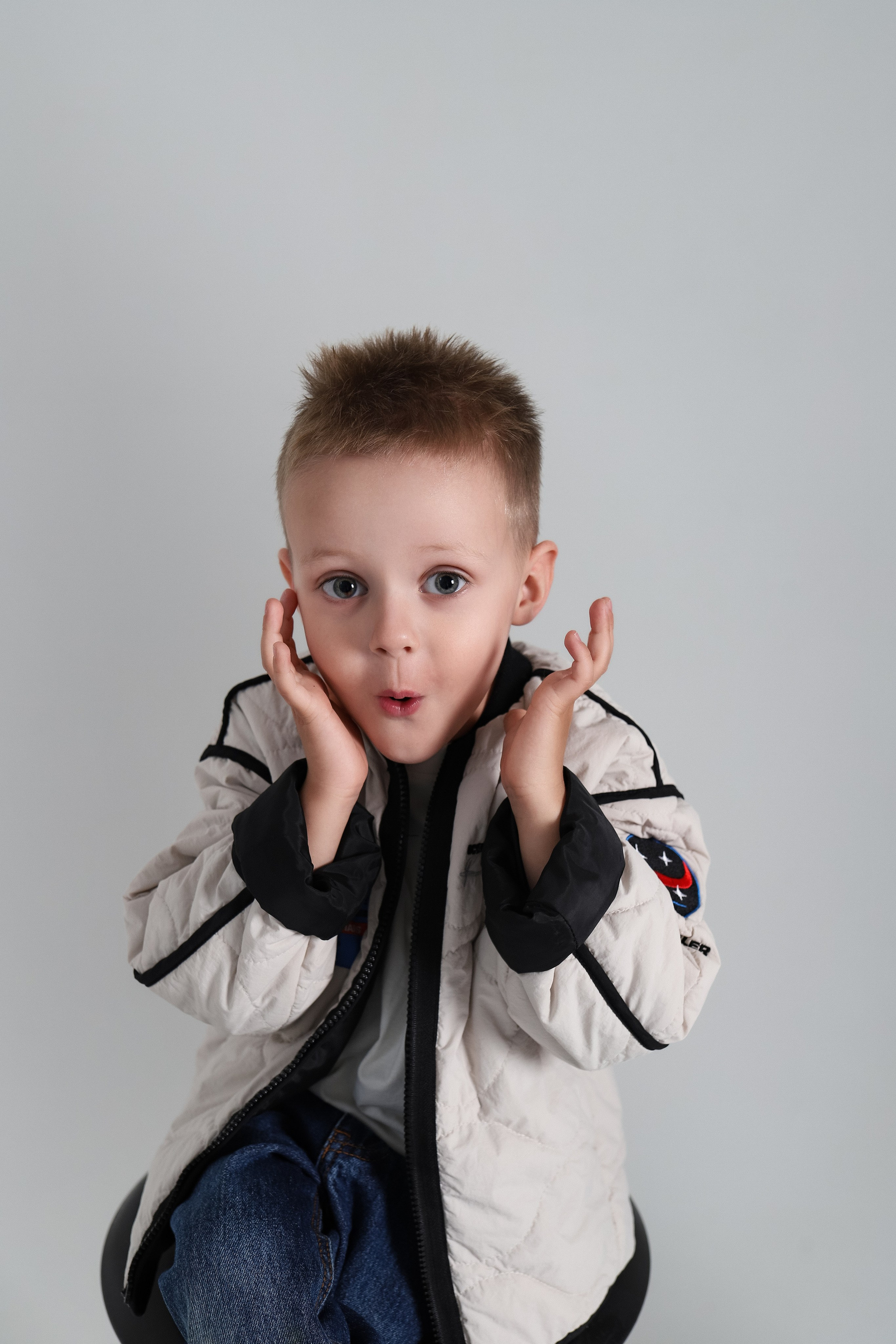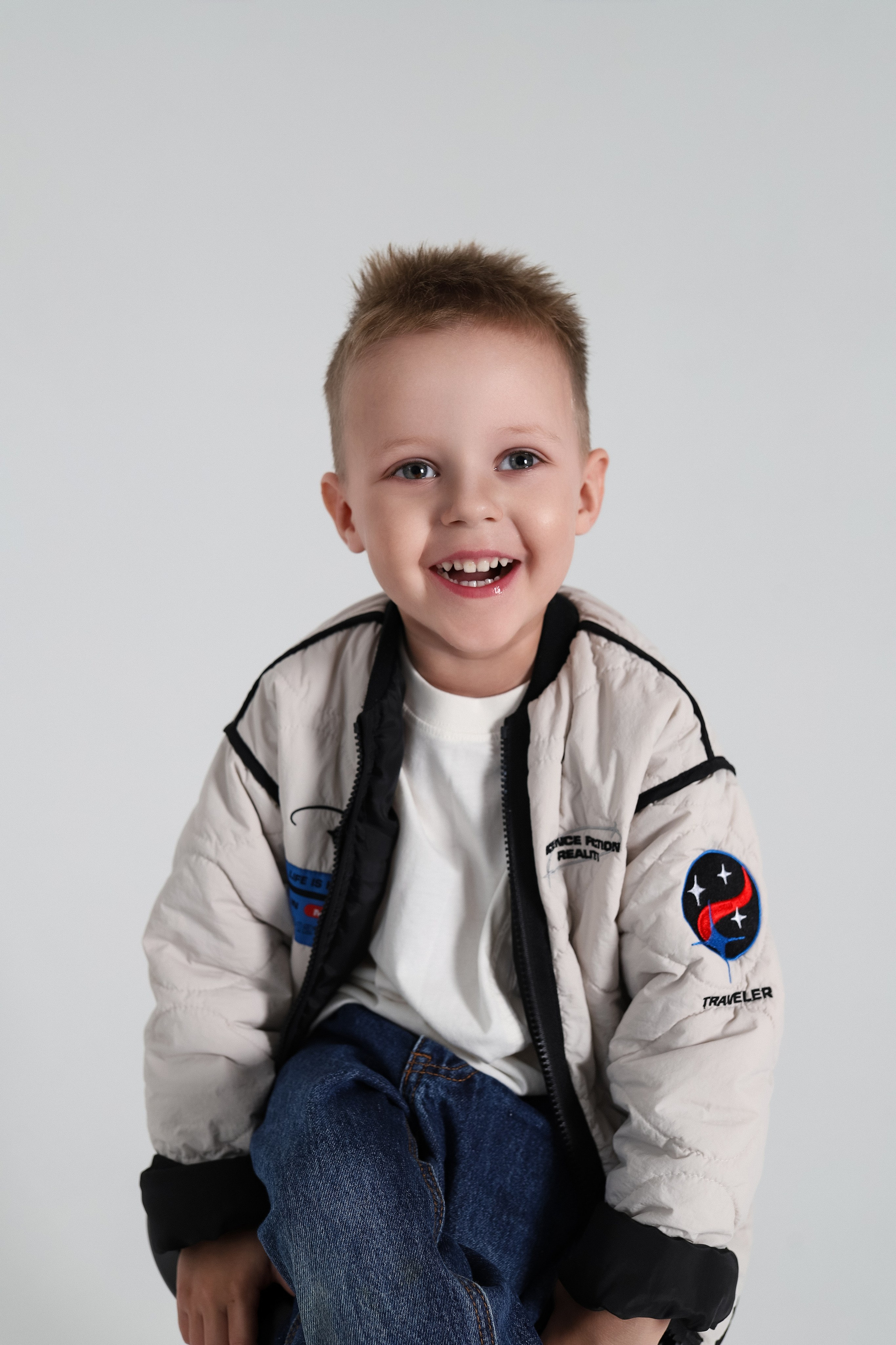Индивидуальная студийная съёмка Артёма, 3 года — начинающего модели. Чистый фон, несколько образов и много игры, чтобы кадры получились живыми и настоящими.