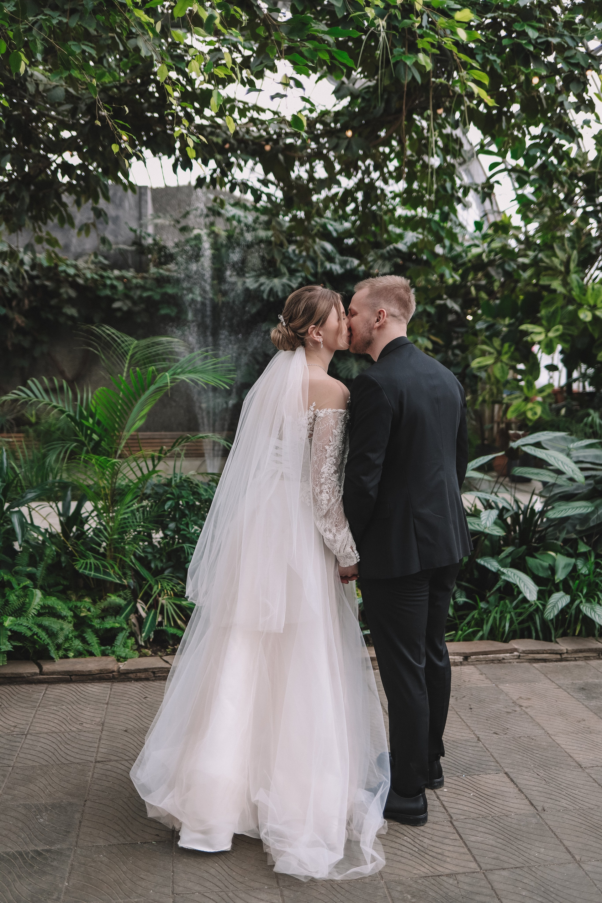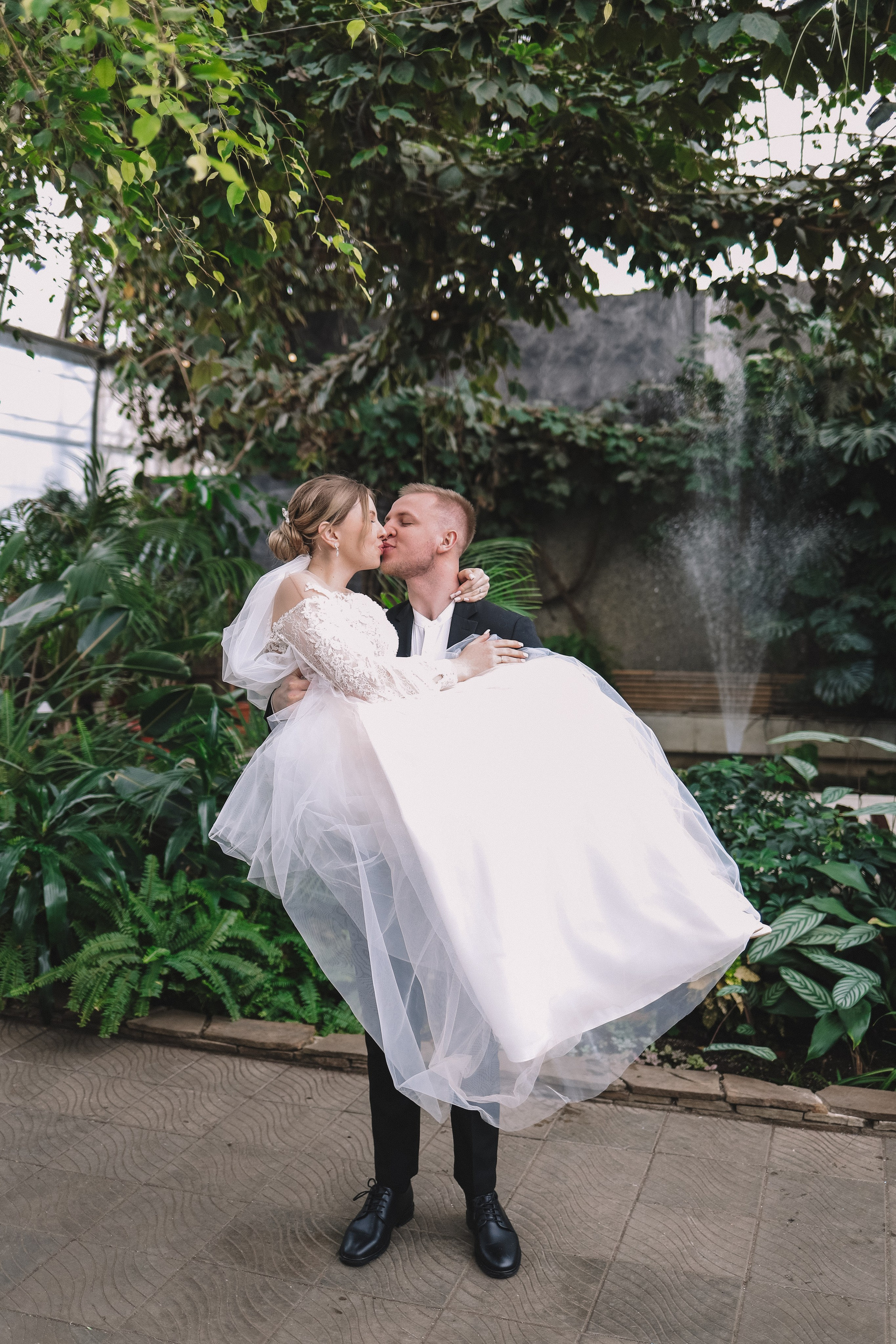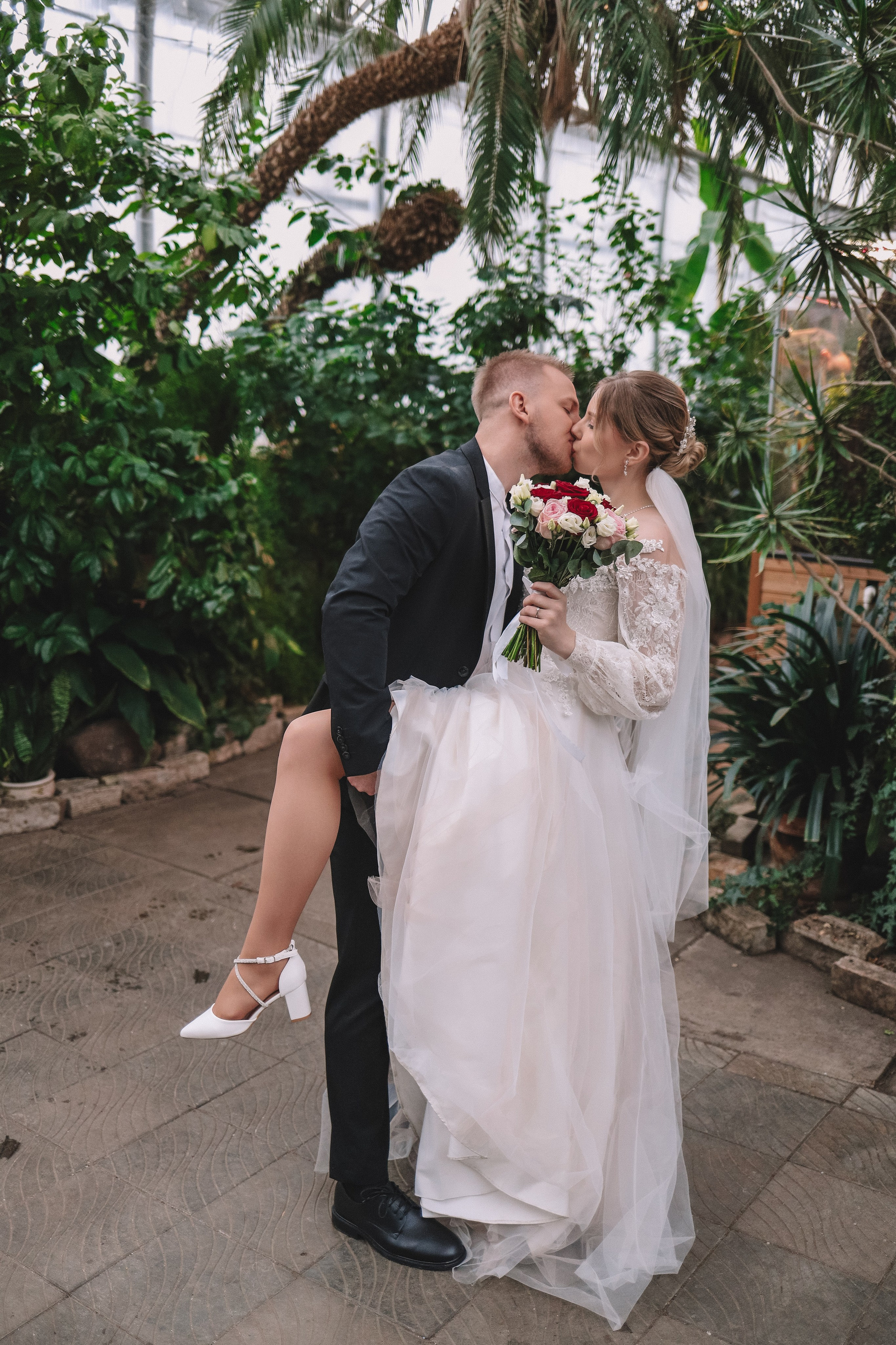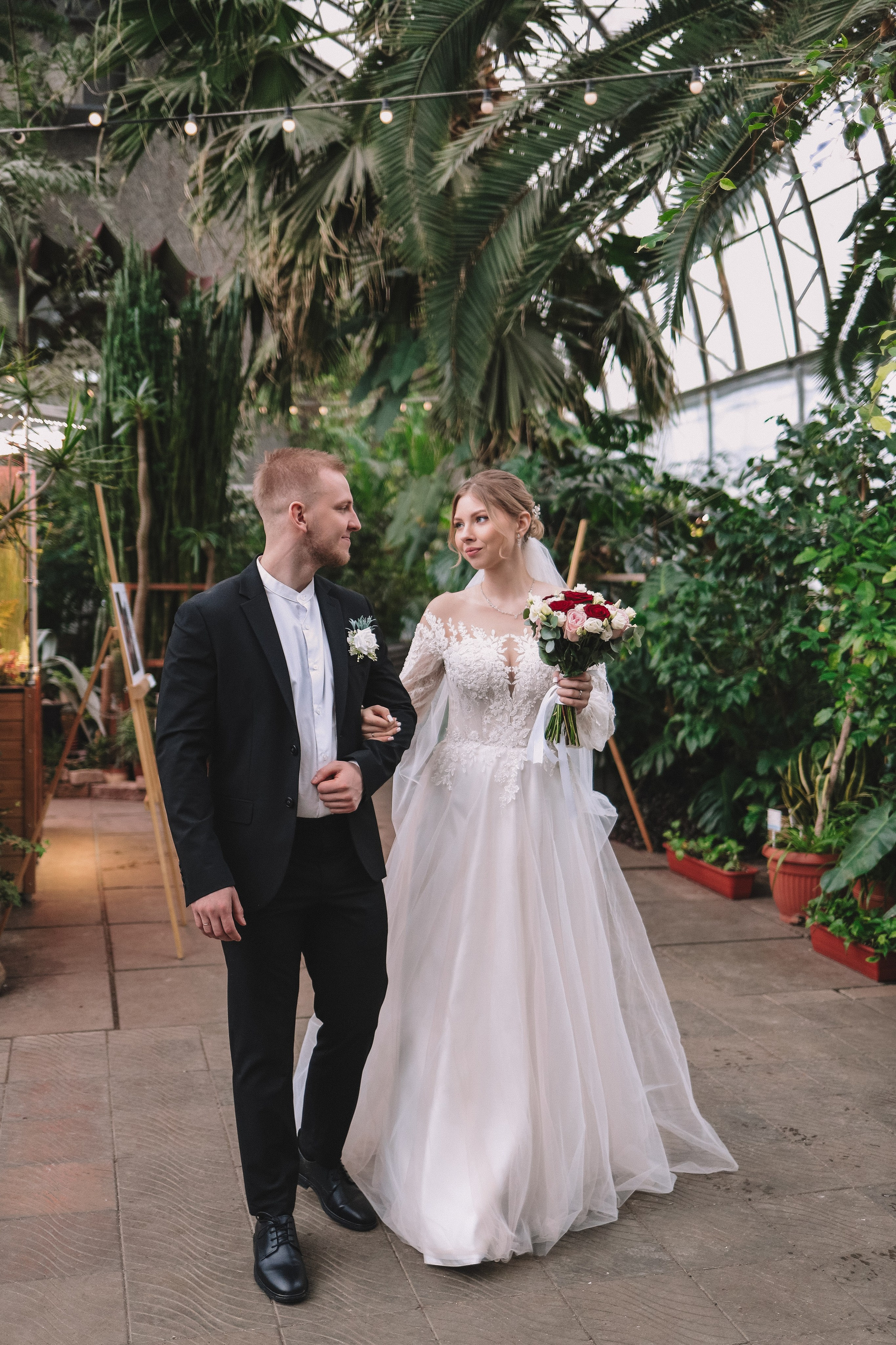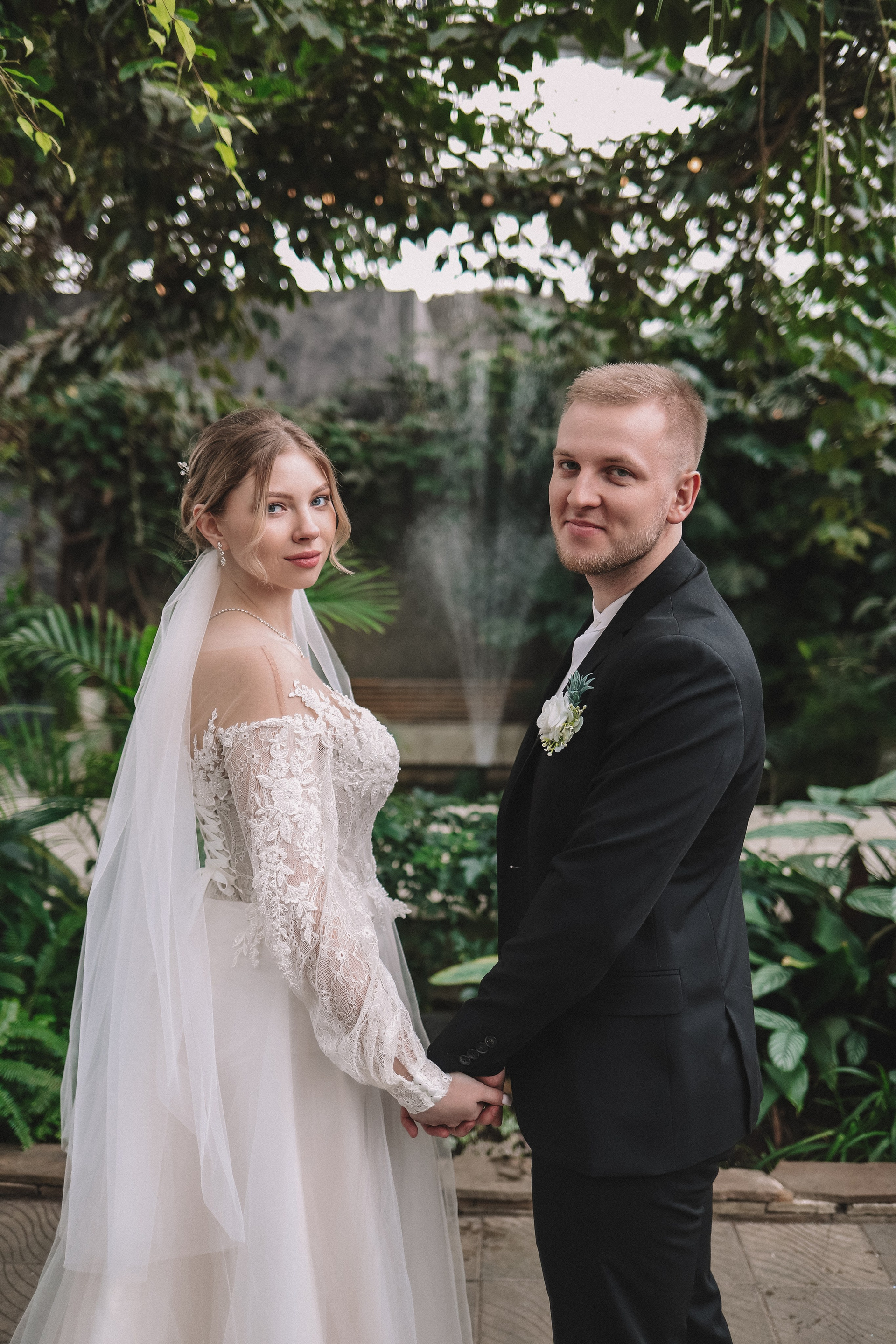 Тёплая свадебная фотосессия в зелёной оранжерее и в интерьерах ЗАГСа. Много живых моментов: прогулка среди растений, нежные портреты, детали образа и эмоции пары без постановки. Спокойный темп съёмки, естественный свет и внимание к мелочам — от букета до взглядов.