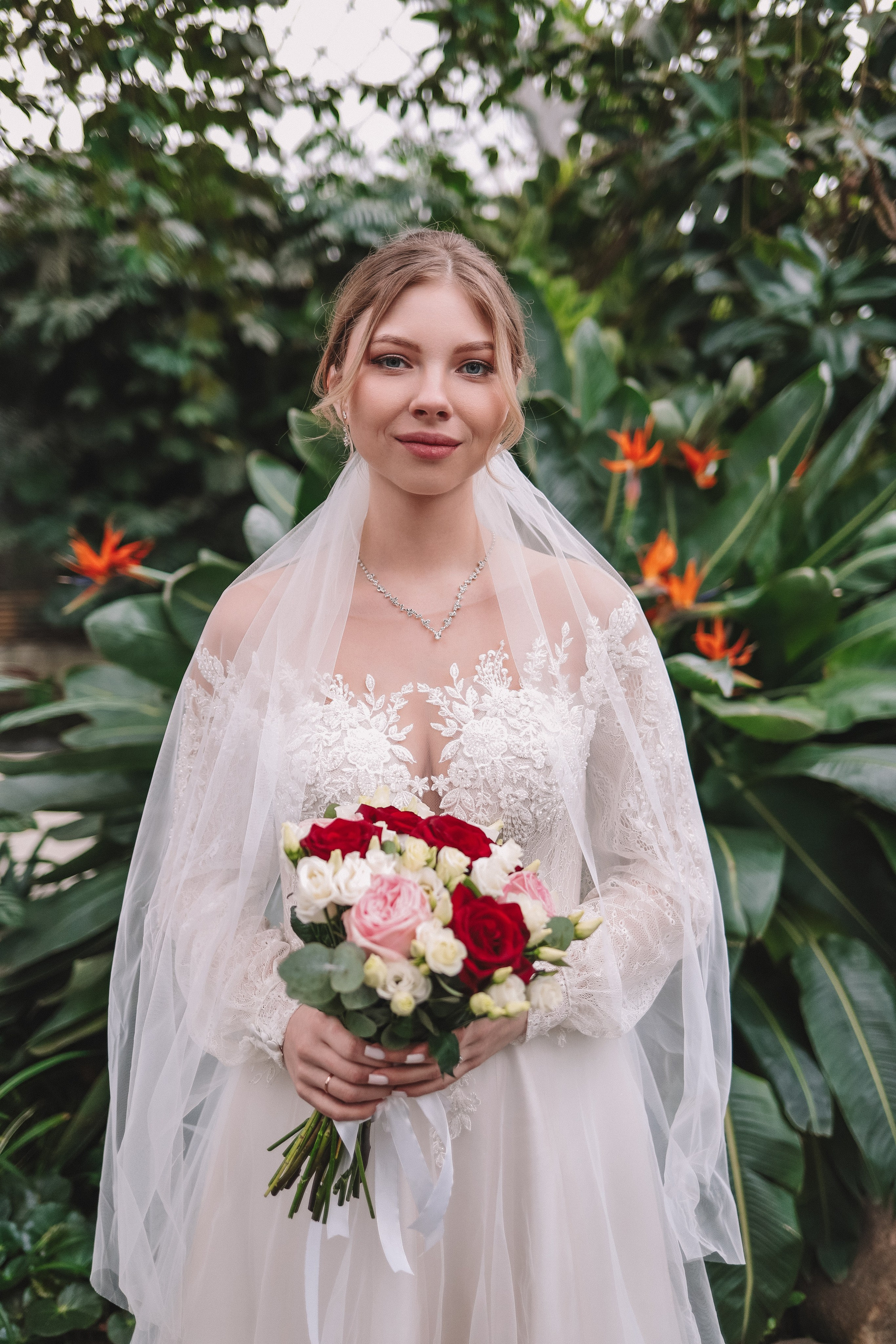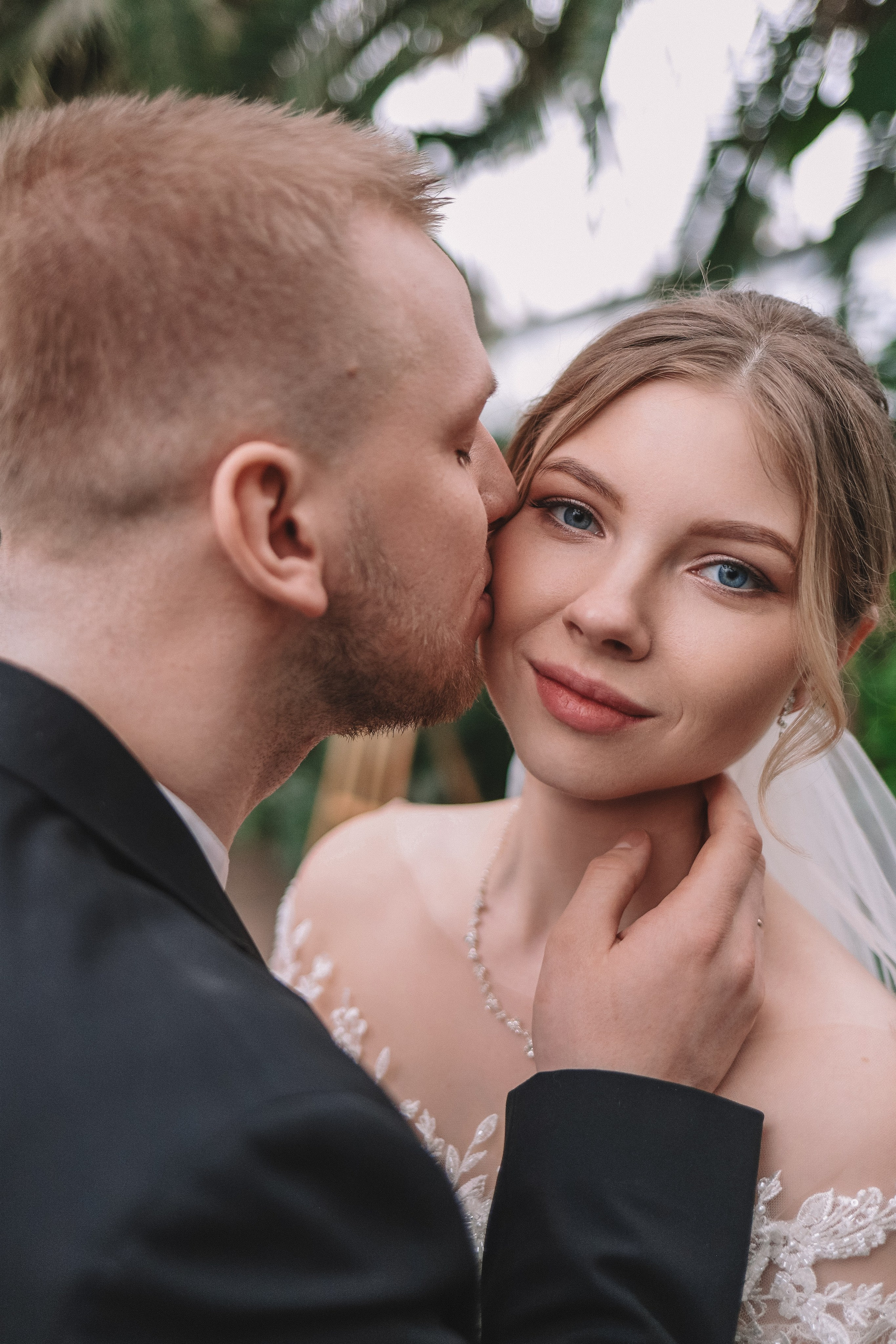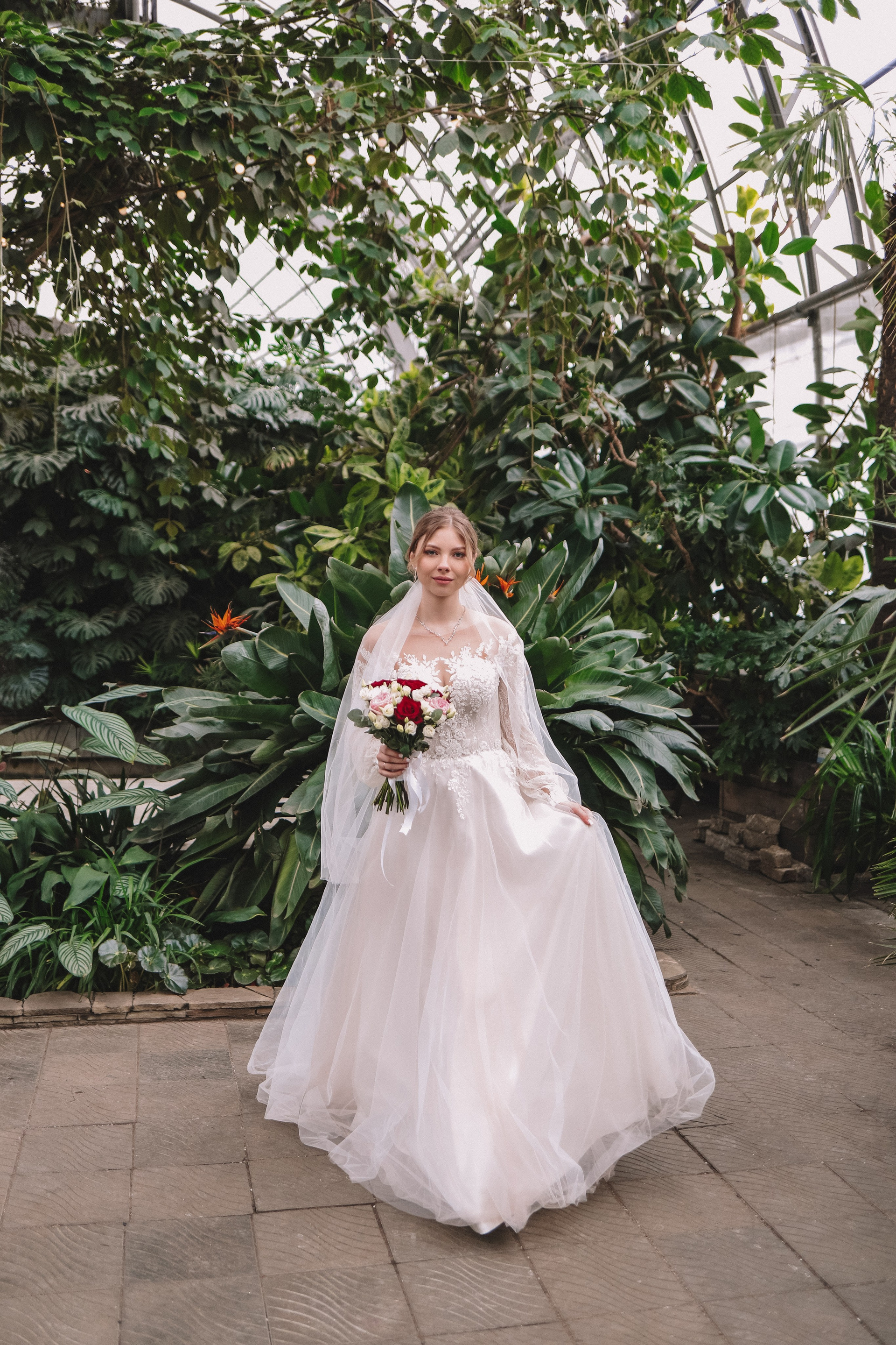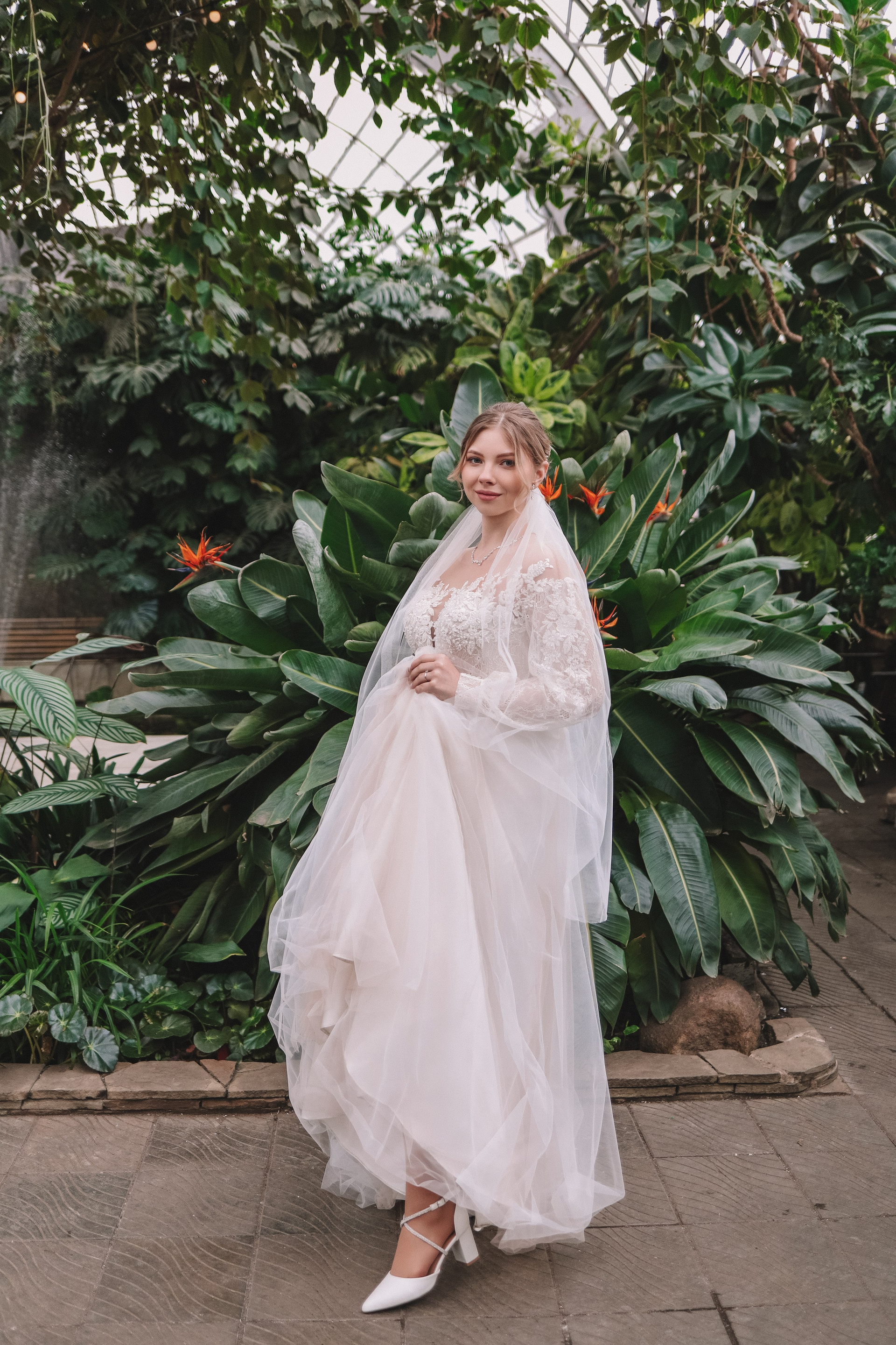 Тёплая свадебная фотосессия в зелёной оранжерее и в интерьерах ЗАГСа. Много живых моментов: прогулка среди растений, нежные портреты, детали образа и эмоции пары без постановки. Спокойный темп съёмки, естественный свет и внимание к мелочам — от букета до взглядов.